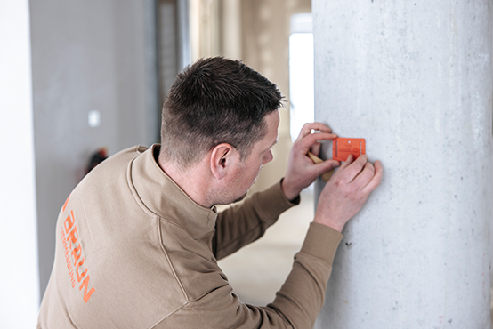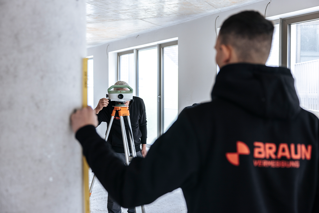 Ein Meterriss ist eine waagerechte Höhenmarkierung auf der Baustelle, die als wichtiger Bezugspunkt für alle weiteren Ausbauarbeiten dient. Er ist für alle am Bau beteiligten Handwerker verbindlich und stellt sicher, dass alle Bauelemente (wie Fenster, Fassaden, Estrich, Türen etc.) im gesamten Gebäude korrekt und auf derselben Höhe montiert werden. Dies ist besonders wichtig, da der Rohboden nicht vollständig eben ist und Höhenunterschiede auftreten können.